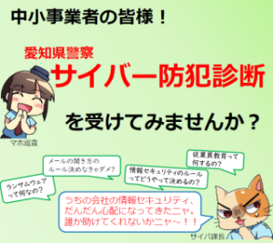 2022年10月28日(金曜日)愛知県警察サイバー犯罪対策課の担当者2名に来所していただき、サイバー防犯診断を行っていただきました。当組合事務所の情報セキュリティを確認していただき色々な助言や情報提供をしてもらいました。 […]